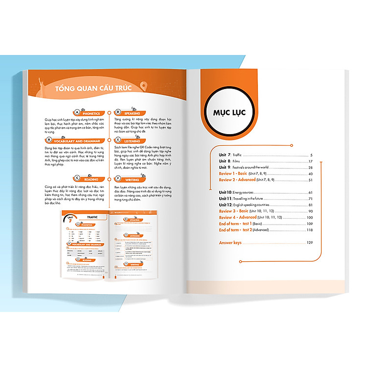 - Cấu trúc mỗi Unit bao gồm 6 phần: Phonetics, Vocabulary and Grammar, Reading, Speaking, Listening, Writing.