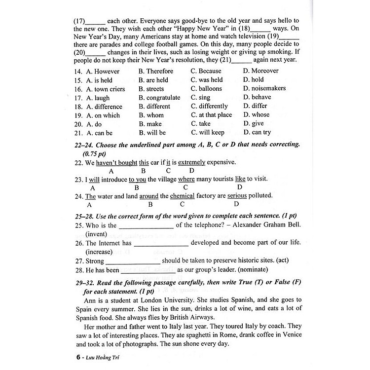 - Phần trắc nghiệm gồm ngữ âm, ngữ pháp, điền khuyết, và tìm lỗi sai.