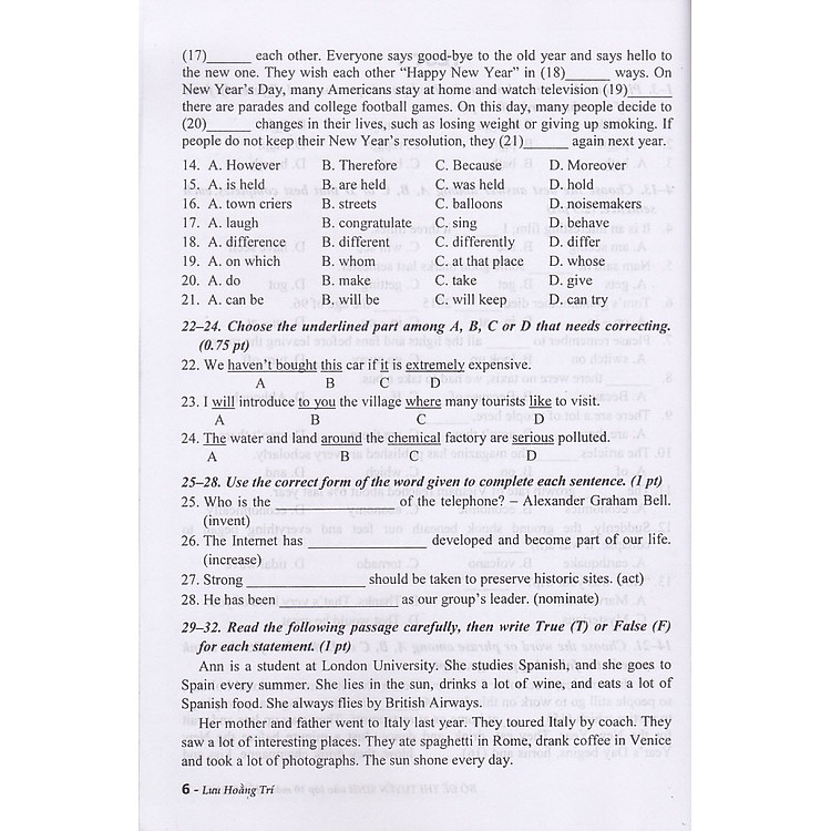 - Phần trắc nghiệm bao gồm ngữ âm, ngữ pháp, điền khuyết và tìm lỗi sai.