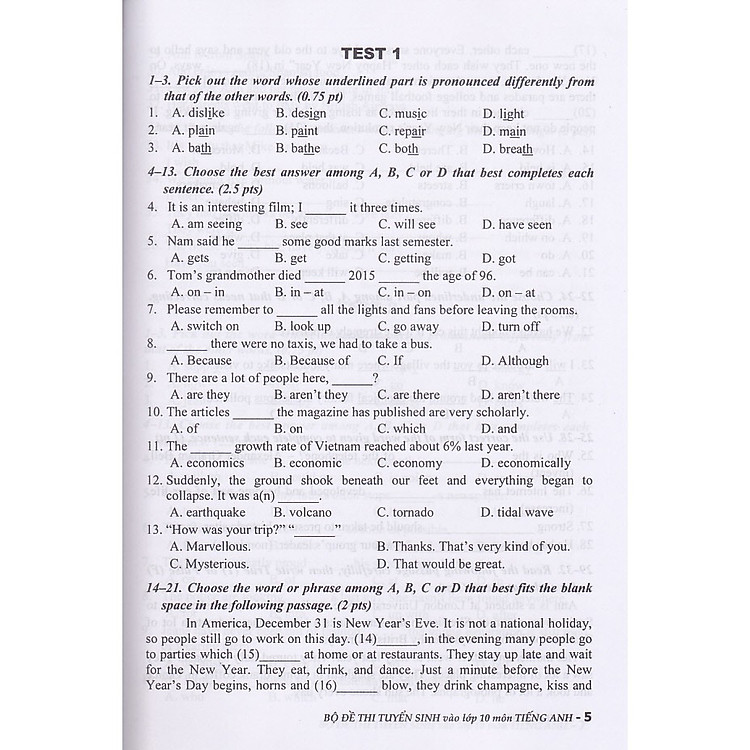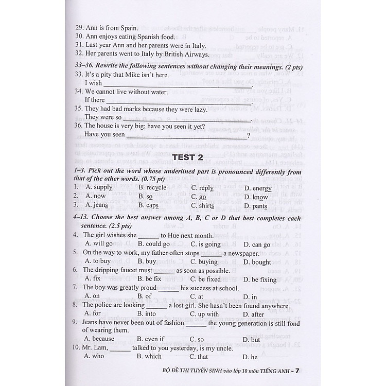 Để giúp các em học sinh lớp 9 có thêm tài liệu để luyện tập, cũng cố, và hệ thống các kiến thức cơ bản trong chương trình ” Tiếng Anh 9″. chuẩn bị cho kì trung học phổ thông, chúng tôi biên soạn cuốn “Bộ đề thi tuyển sinh vào lớp 10 môn Tiếng Anh”.Nội dung cuốn sách được biên soạn bám sát theo cáu trúc đề thi tuyển sinh vào lớp 10 trung học phổ thông do Sở Giáo dục và Đào tạo TP. Hồ Chí Minh công bố, và chương trình Tiếng Anh bậc Trung học cơ sở, chủ yếu ở lớp 9.Đề thi tuyển sinh lớp 10 gồm hai phần:Phần trắc nghiệm (6 điểm )