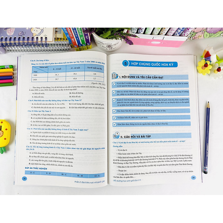 – Câu hỏi, bài tập: Gồm hệ thống câu hỏi, bài tập phù hợp với quá trình bồi dưỡng học sinh giỏi đi từ thấp lên cao, từ đơn giản đến phức tạp. Các câu hỏi và bài tập chú trọng vào việc phát triển năng lực nhận thức thế giới theo quan điểm không gian, giải thích các hiện tượng và quá trình địa lí, sử dụng các công cụ địa lí học; vận dụng kiến thức, kĩ năng đã họ