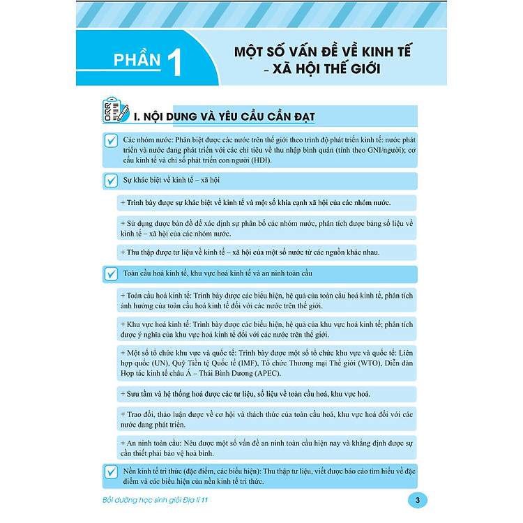 – Phần I: Một số vấn đề về kinh tế – xã hội thế giới, gồm các nội dung: Sự khác biệt về trình độ phát triển kinh tế – xã hội của các nhóm nước; Toàn cầu hoá, khu vực hoá kinh tế; Một số tổ chức khu vực và quốc tế; Một số vấn đề an ninh toàn cầu.