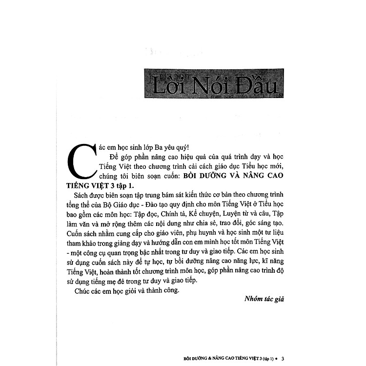 Để góp phần nâng cao hiệu quả của quá trình dạy và học Tiếng Việt theo chương trình cải cách giáo dục Tiểu học mới, chúng tôi biên soạn cuốn: Bồi Dưỡng Và Nâng Cao Tiếng Việt 3 – Tập 1.