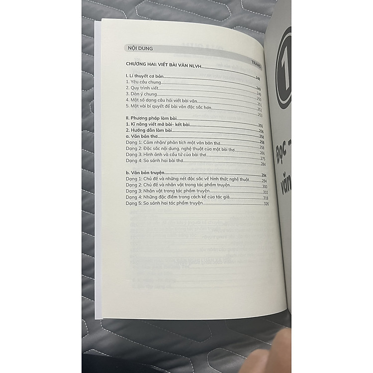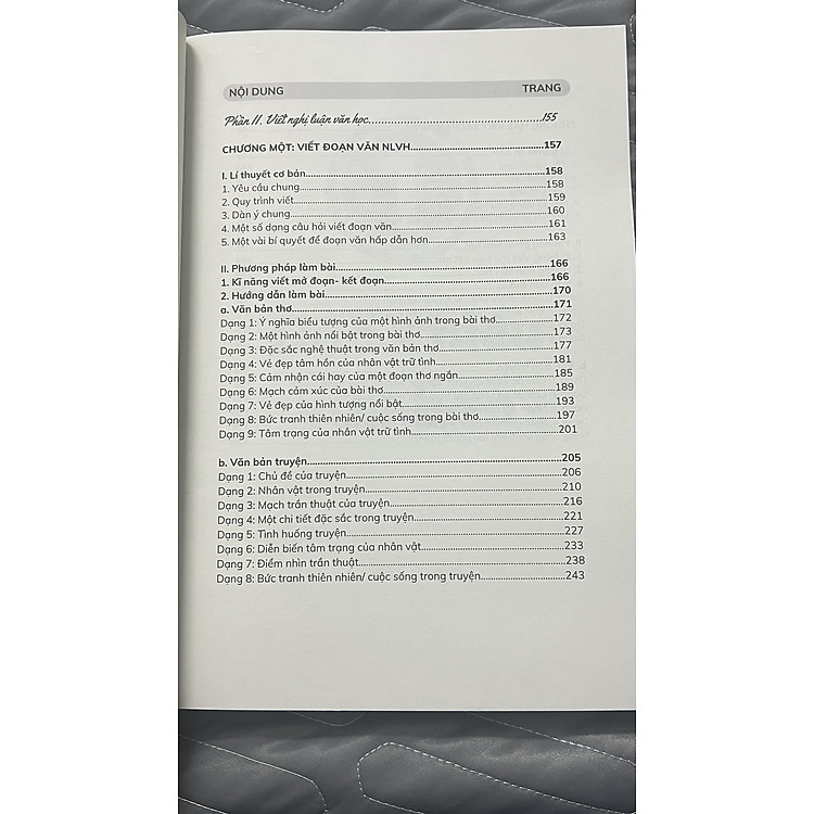 Phần viết nghị luận văn học cũng không kém phần hấp dẫn. Sách hướng dẫn cách mở bài, kết bài và đưa ra nhiều dàn ý mẫu, giúp người viết hình thành tư duy logic trong việc xây dựng bài viết. Đặc biệt, tài liệu bổ trợ kèm theo rất giá trị, với bộ 20 đề đọc hiểu có đáp án.