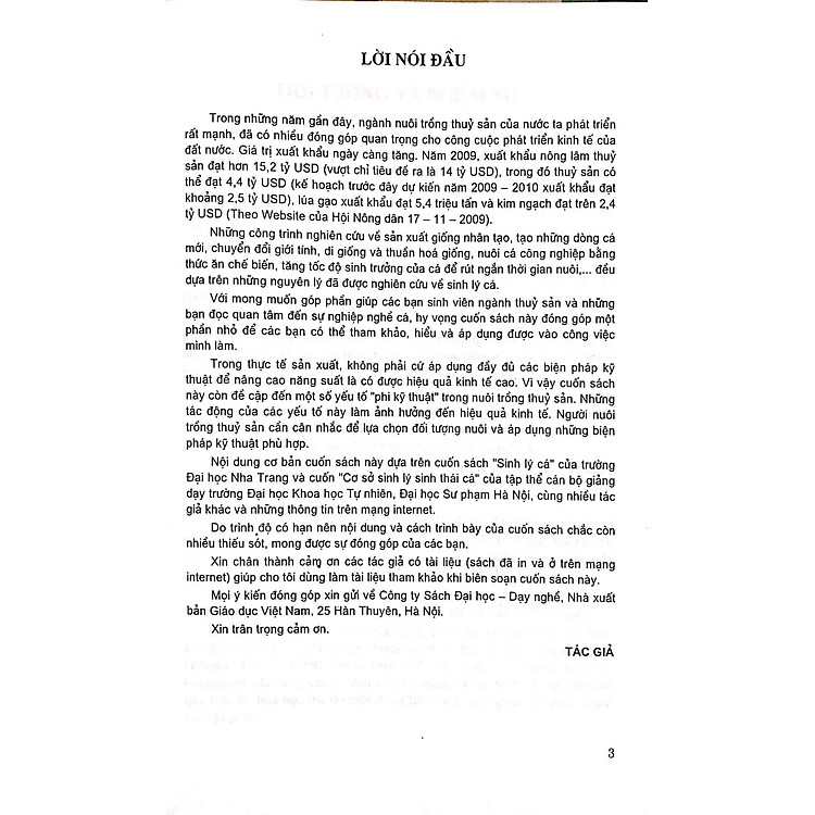 Trong những năm gần đây, ngành nuôi trồng thuỷ sản của nước ta phát triển rất mạnh, đã có nhiều đóng góp quan trọng cho công cuộc phát triển kinh tế của đất nước. Giá trị xuất khẩu ngày càng tăng. Năm 2009, xuất khẩu nông lâm thuỷ sản đạt hơn 15,2 tỷ USD (vượt chỉ tiêu đề ra là 14 tỷ USD), trong đó thuỷ sản có thể đạt 4,4 tỷ USD (kế hoạch trước đây dự kiến năm 2009 – 2010 xuất khẩu đạt khoảng 2,5 tỷ USD), lúa gạo xuất khẩu đạt 5,4 triệu tấn và kim ngạch đạt trên 2,4 tỷ USD (Theo Website của Hội Nông dân 17 – 11 – 2009). Những công trình nghiên cứu về sản xuất giống nhân tạo, tạo những dòng cá mới, chuyển đổi giới tính, di giống và thuần hoá giống, nuôi cá công nghiệp bằng thức ăn chế biến, tăng tốc độ sinh trưởng của cá để rút ngắn thời gian nuôi, đều dựa trên những nguyên lý đã được nghiên cứu về sinh lý cá. Với mong muốn góp phần giúp các bạn sinh viên ngành thuỷ sản và những bạn đọc quan tâm đến sự nghiệp nghề cá, hy vọng cuốn sách này đóng góp một phần nhỏ để các bạn có thể tham khảo, hiểu và áp dụng được vào công việc mình làm. Trong thực tế sản xuất, không phải cứ áp dụng đầy đủ các biện pháp kỹ thuật để nâng cao năng suất là có được hiệu quả kinh tế cao. Vì vậy cuốn sách này còn đề cập đến một số yếu tố “phi kỹ thuật” trong nuôi trồng thuỷ sản. Những tác động của các yếu tố này làm ảnh hưởng đến hiệu quả kinh tế. Người nuôi trồng thuỷ sản cần cân nhắc để lựa chọn đối tượng nuôi và áp dụng những biện pháp kỹ thuật phù hợp. Nội dung cơ bản cuốn sách này dựa trên cuốn sách “Sinh lý cá” của trường Đại học Nha Trang và cuốn “Cơ sở sinh lý sinh thái cá” của tập thể cán bộ giảng dạy trường Đại học Khoa học Tự nhiên, Đại học Sư phạm Hà Nội, cùng nhiều tác giả khác và những thông tin trên mạng internet. Do trình độ có hạn nên nội dung và cách trình bày của cuốn sách chắc còn nhiều thiếu sót, mong được sự đóng góp của các bạn.Giá sản phẩm trên Tiki đã bao gồm thuế theo luật hiện hành. Bên cạnh đó, tuỳ vào loại sản phẩm, hình thức và địa chỉ giao hàng mà có thể phát sinh thêm chi phí khác như phí vận chuyển, phụ phí hàng cồng kềnh, thuế nhập khẩu (đối với đơn hàng giao từ nước ngoài có giá trị trên 1 triệu đồng)…..