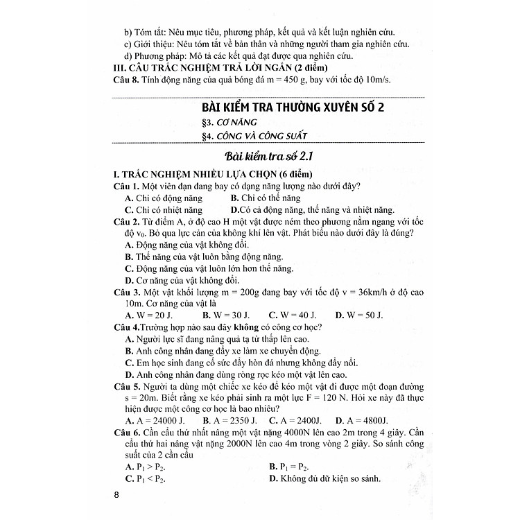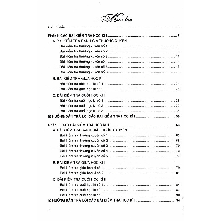 - Cuốn sách bao gồm hai phần cho học kì I và II, mỗi học kì có 3 loại bài kiểm tra: thường xuyên, giữa học kì và cuối học kì.