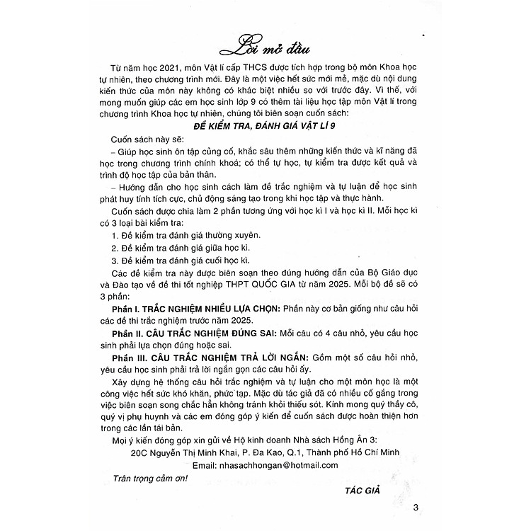 Từ năm học 2021, môn Vật lí cấp THCS được tích hợp trong bộ môn Khoa học tự nhiên, theo chương trình mới. Đây là một việc hết sức mới mẻ, mặc dù nội dung kiến thức của môn này không có khác biệt nhiều so với trước đây. Vì thế, với mong muốn giúp các em học sinh lớp 9 có thêm tài liệu học tập môn Vật lí trong chương trình Khoa học tự nhiên, chúng tôi biên soạn cuốn sách: ĐỂ KIỂM TRA, ĐÁNH GIÁ VẬT LÍ 9