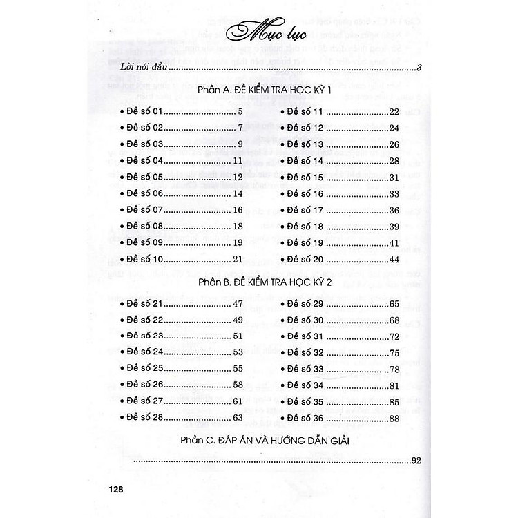 - Cuốn sách chia thành 3 phần: Đề kiểm tra học kỳ 1, Đề kiểm tra học kỳ 2, và Đáp án cùng hướng dẫn giải.