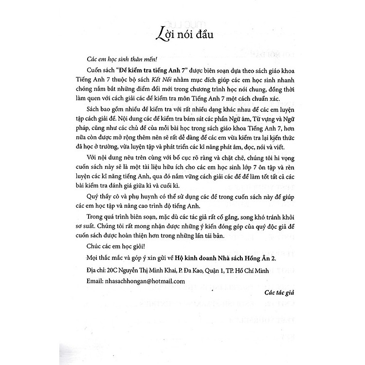 Với nội dung nêu trên cùng với bố cục rõ ràng và chặt chẽ, chúng tôi hi vọng cuốn sách này sẽ là một tài liệu hữu ích cho các em học sinh lớp 7 ôn tập và rèn luyện các kĩ năng tiếng Anh, qua đó nắm vững cách giải các đề để làm tốt tất cả các bài kiểm tra đánh giá giữa kì và cuối kì.