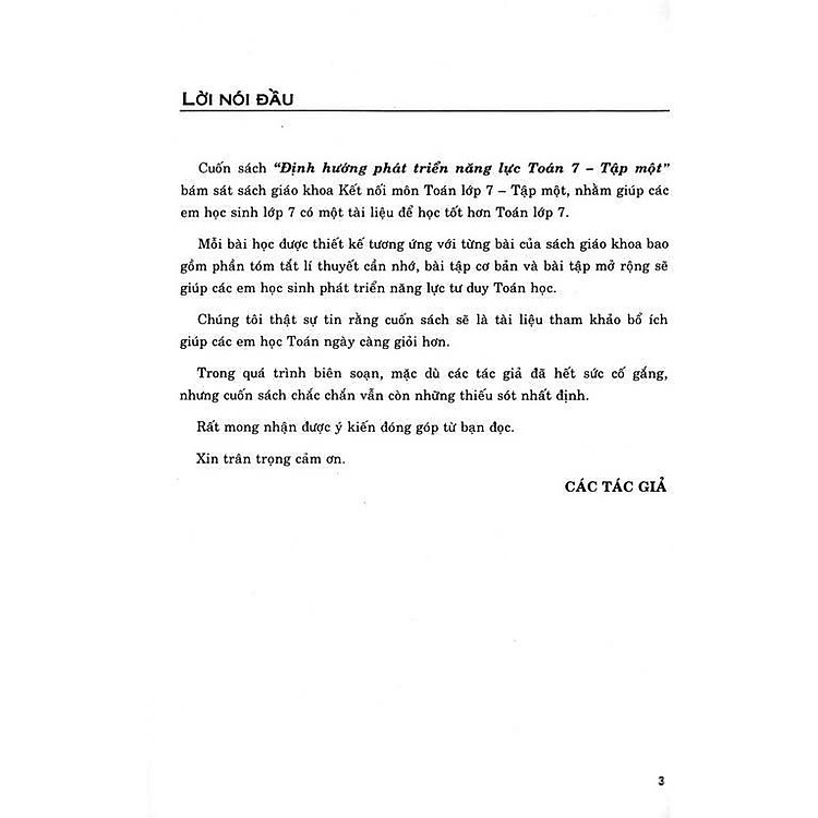 Cuốn sách “Định Hướng Phát Triển Năng Lực Toán Lớp 7 – Bám Sát SGK Kết Nối” thực sự là một tài liệu rất hữu ích cho các em học sinh lớp 7. Nội dung sách được thiết kế bám sát chương trình học, giúp các em dễ dàng nắm bắt kiến thức cùng với các bài tập phong phú từ cơ bản đến nâng cao.
