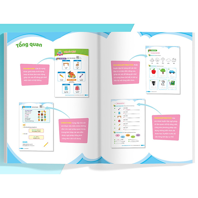 • Các phần lý thuyết và bài tập vận dụng đưa các em tiếp cận đầy đủ các kỹ năng: nghe, nói, đọc, viết, từ đó tạo dựng nền tảng tiếng Anh vững chắc.