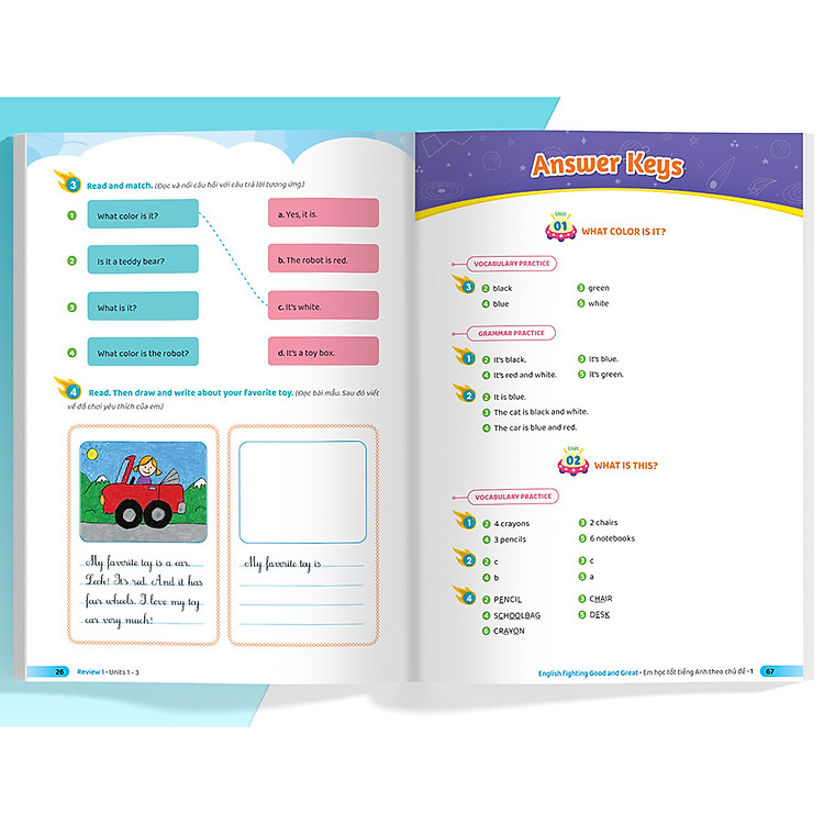 Với các chủ đề gần gũi, cấu trúc mỗi bài học chặt chẽ, English Fighting Good and Great Em học tốt tiếng Anh theo chủ đề lớp 1 sẽ là một trợ thủ đắc lực giúp các em học sinh học tốt và giỏi tiếng Anh.Giá sản phẩm trên Tiki đã bao gồm thuế theo luật hiện hành. Bên cạnh đó, tuỳ vào loại sản phẩm, hình thức và địa chỉ giao hàng mà có thể phát sinh thêm chi phí khác như phí vận chuyển, phụ phí hàng cồng kềnh, thuế nhập khẩu (đối với đơn hàng giao từ nước ngoài có giá trị trên 1 triệu đồng)…..