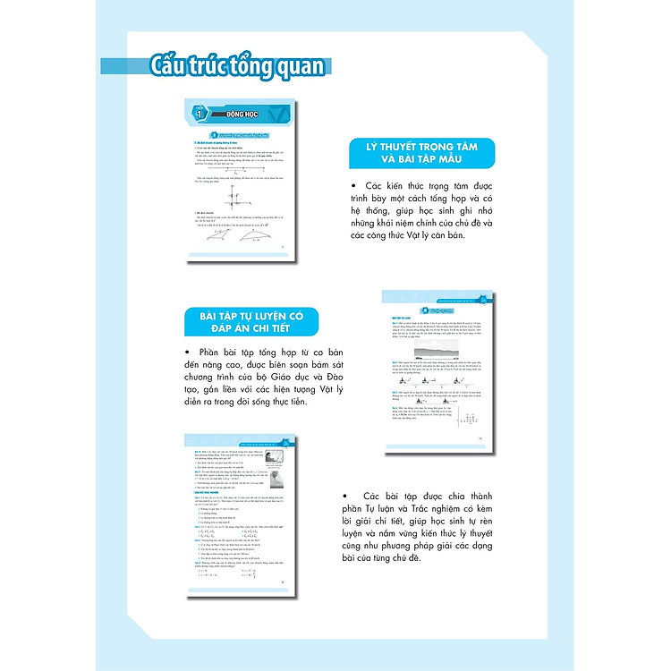 - Nội dung sách gồm 6 chủ đề trọng tâm: Động học, Động lực học, Năng lượng, Động lượng, Chuyển động tròn, và Biến dạng vật rắn – Áp suất chất lỏng.