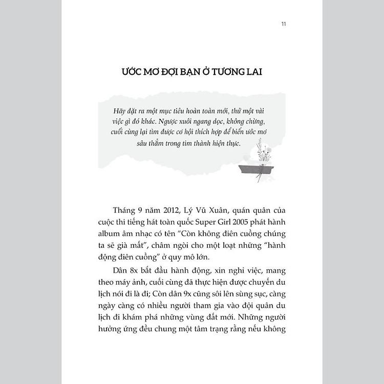 Những người đang có kế hoạch và mục tiêu hành động sẽ nhìn thấy được con đường hay hướng đi của mình một cách rõ ràng hơn. Với những bạn đang ẩn nấp trong cái “vỏ ốc” an toàn của bản thân, cuốn sách hy vọng bạn sẽ tìm thấy động lực để thay đổi và nỗ lực. Thanh xuân quý giá như vậy, bạn lại không nỗ lực trở thành phiên bản hoàn hảo nhất của bản thân, không dám mạo hiểm, không dám nghĩ lớn hơn, thì sau này bạn lấy gì để kể cho con cháu mình nghe đây?