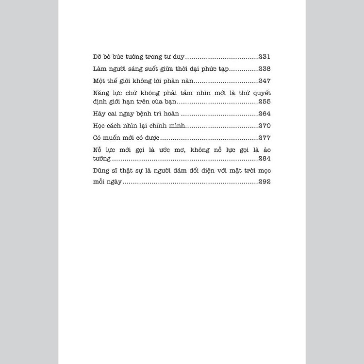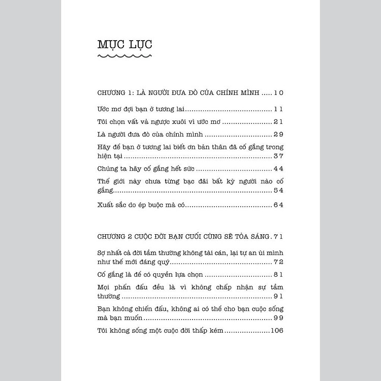 - Chương sách: Gồm 4 chương: Làm chủ cuộc đời, Tỏa sáng, Không chọn an nhàn, và Không phàn nàn.