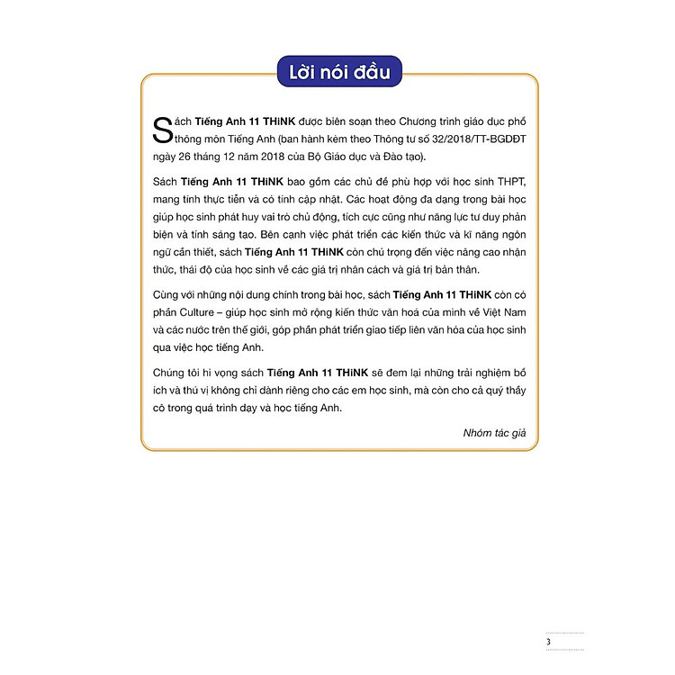 Sách Tiếng Anh 11 – THiNK (Student’s Book) là một trong những tài liệu học tập quan trọng dành cho học sinh lớp 11, giúp các em nắm vững kiến thức tiếng Anh theo chương trình giáo dục phổ thông. Sách được biên soạn theo chương trình mới nhất (ban hành kèm theo Thông Tư số 32/2018/TT-BGDĐT ngày 2 tháng 10 năm 2018), đảm bảo tính cập nhật và phù hợp với nhu cầu học tập hiện nay.