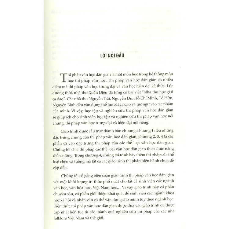 Giáo trình “Thi Pháp Văn Học Dân Gian” là một trong những tài liệu quan trọng dành cho sinh viên và những ai yêu thích nghiên cứu về văn học dân gian. Đây là một môn học thuộc hệ thống thi pháp văn học, giúp người học hiểu rõ hơn về các yếu tố nghệ thuật và cấu trúc của văn học dân gian. Qua giáo trình này, bạn sẽ khám phá được những nét đặc sắc và phong phú của thể loại văn học này, đồng thời nhận thấy sự kế thừa và phát triển của nó so với thi pháp văn học trung đại và hiện đại.