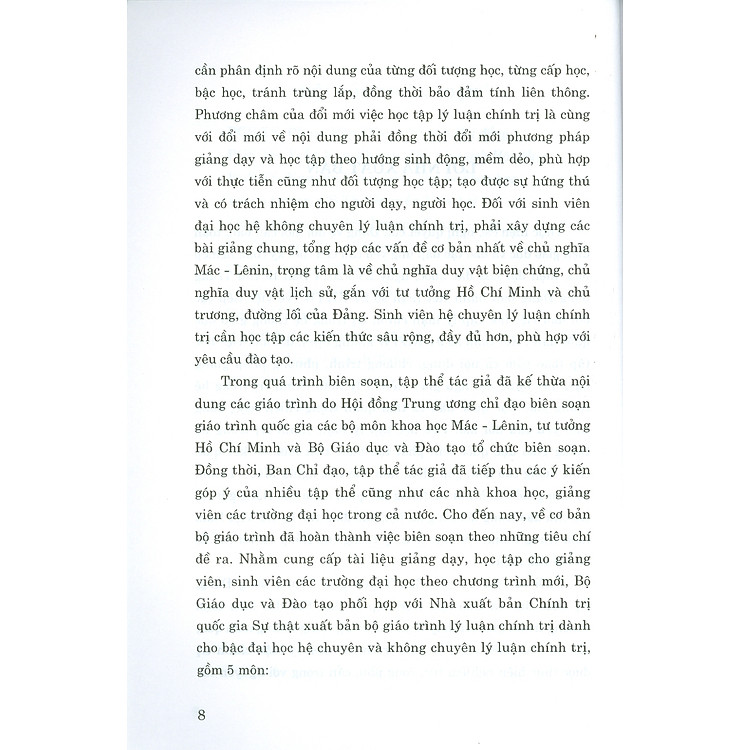 Bộ giáo trình lý luận chính trị gồm 3 cuốn: Giáo Trình Triết Học Mác – Lênin, Giáo Trình Kinh Tế Chính Trị Mác – Lênin, và Giáo Trình Lịch Sử Đảng Cộng Sản Việt Nam. Bộ sách này được thiết kế đặc biệt dành cho bậc đại học hệ không chuyên lý luận chính trị, phục vụ cho việc giảng dạy và học tập của giảng viên, sinh viên tại các trường đại học.