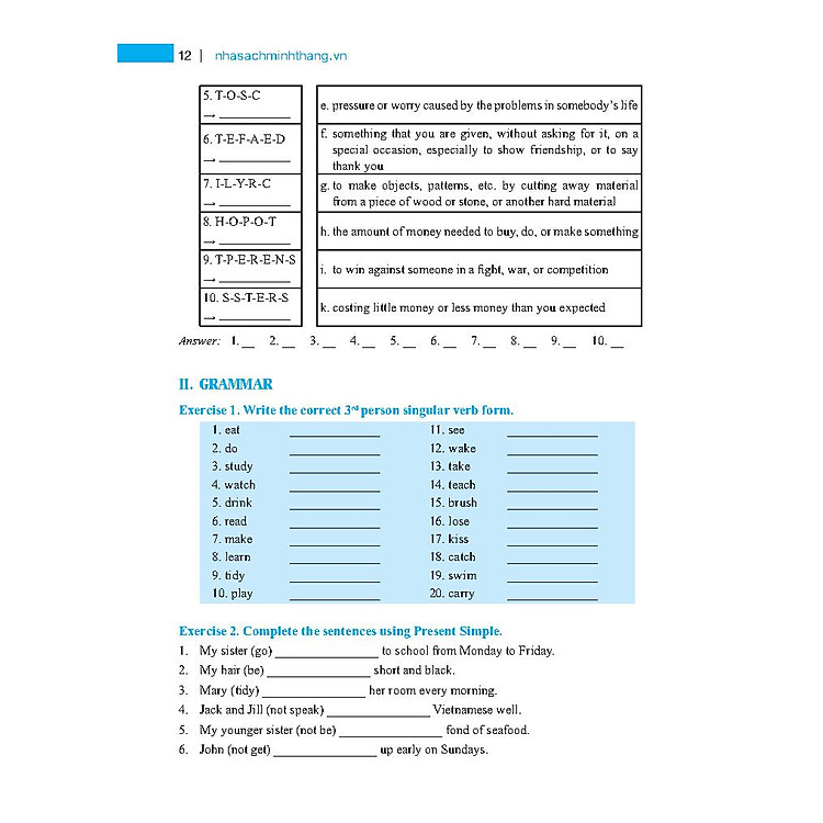 Sách bài tập này được biên soạn dựa trên phương pháp học tập hiện đại, kết hợp giữa lý thuyết và thực hành. Các bài tập đa dạng từ dễ đến khó, giúp học sinh làm quen với các cấu trúc ngữ pháp, từ vựng và các tình huống giao tiếp thực tế. Đặc biệt, phần không có đáp án khuyến khích học sinh tự tìm hiểu và suy nghĩ độc lập, từ đó nâng cao khả năng tự học và tự đánh giá.