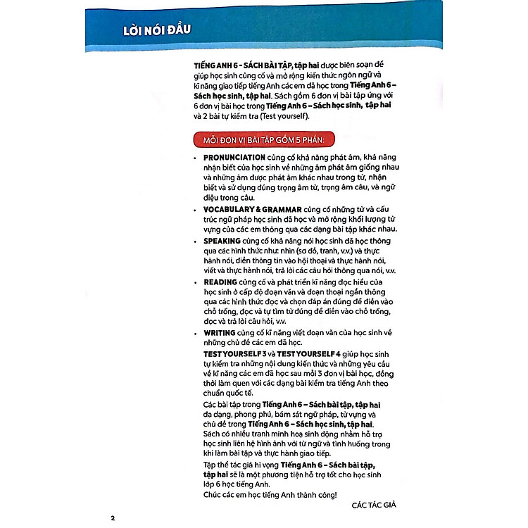 Global Success – Tiếng Anh 6 – Sách Bài Tập – Tập Hai là một tài liệu học tập thiết yếu dành cho học sinh lớp 6, được biên soạn với mục tiêu giúp các em củng cố và mở rộng kiến thức ngôn ngữ cũng như kỹ năng giao tiếp bằng tiếng Anh. Tái bản năm 2023, cuốn sách này không chỉ cập nhật kiến thức mới mà còn cải tiến nội dung để phù hợp hơn với nhu cầu học tập của học sinh hiện nay.