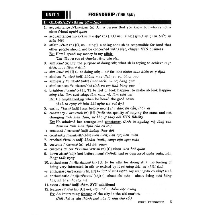 Từ vựng (Glossary) :Gồm tất cả các từ mới trong bài. Các từ đều được phiên âm theo hệ phiên âm quốc tế mới và được định nghĩa sát với nghĩa trong bài học, có ví dụ minh hoa.