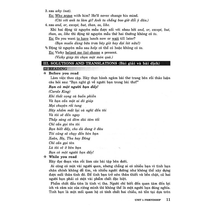 Bài giải và bài dịch (Solutions and translations): giải và dịch tất cả các bài đối thoại, bài học trong sách giáo khoa và băng Cassette Tiếng Anh 11. (Lưu ý : Học sinh cần tự làm bài tập và nghe băng trước khi tham khảo phần này, như vậy thì sẽ nhớ bài lâu và hiểu bài kỹ hơn)