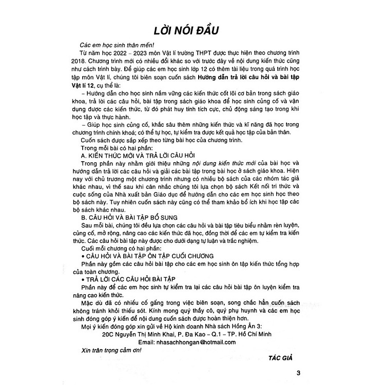 Từ năm học 2022 – 2023 môn Vật lí trường THPT được thực hiện theo chương trình 2018. Chương trình mới có nhiều đổi khác so với trước đây về nội dung kiến thức cũng như cách trình bày. Để giúp các em học sinh lớp 12 có thêm tài liệu trong quá trình học tập môn Vật lí, chúng tôi biên soạn cuốn sách Hướng dẫn trả lời câu hỏi và bài tập Vật lí 12, cụ thể là: