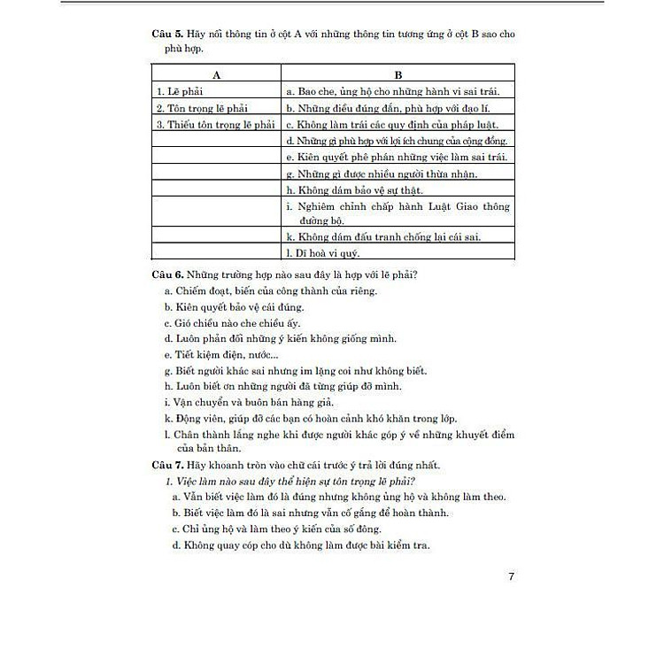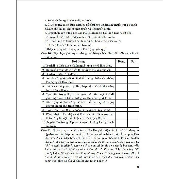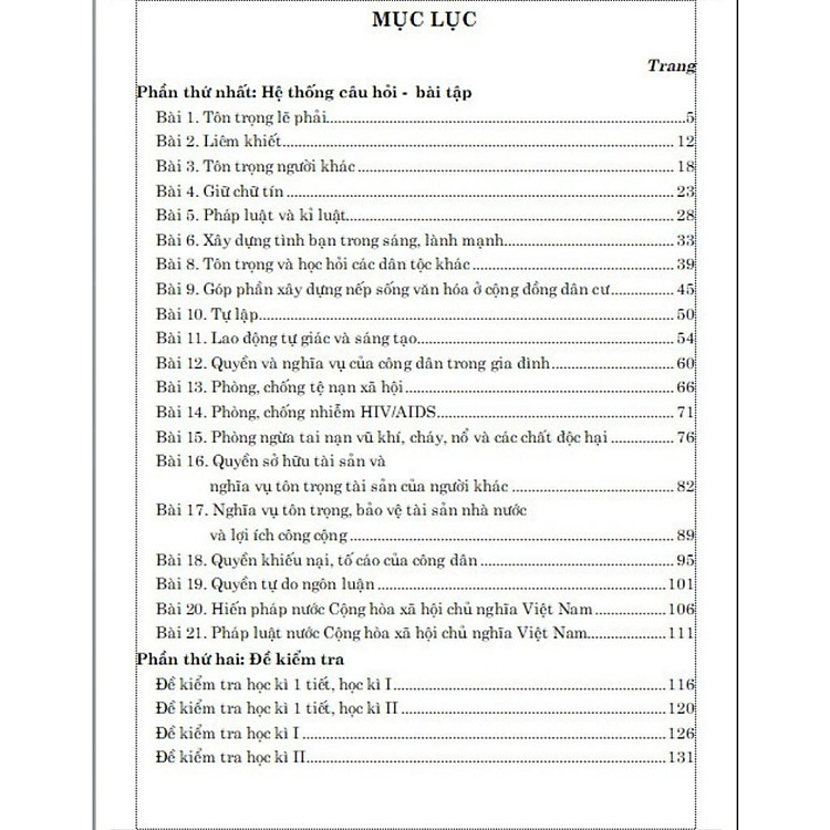Các đề kiểm tra 1 tiết và học kỳ có cấu trúc thống nhất: I. Mục tiêu kiểm tra, II. Hình thức kiểm tra, III. Ma trận đề kiểm tra, IV. Đề kiểm tra, V. Đáp án, thang điểm và hướng dẫn chấm. Do đặc thù của môn Giáo dục công dân, các câu hỏi trong đề kiểm tra không chỉ kiểm tra kiến thức mà quan trọng là kiểm tra các kĩ năng, thái độ, tình cảm của học sinh đối với các hiện tượng, vấn đề đạo đức và pháp luật trong cuộc sống