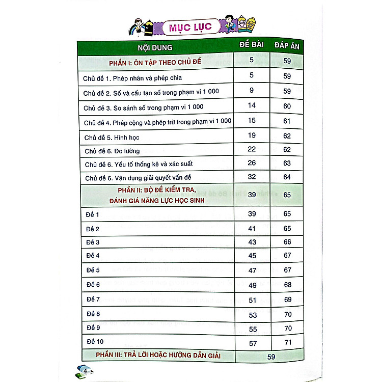 Trong phần này, chúng tôi phân chia thành các chủ đề: Số, So sánh số, Các phép tính, Hình học, Đo lường, Yếu tố thống kê và xác suất. Vận dụng giải quyết vấn đề (giải các dạng toán có lời văn). Trong mỗi chủ đề gồm hệ thống bài tập sắp xếp theo thang đánh giá năng lực ba mức (nhận biết, kết nối và vận dụng).