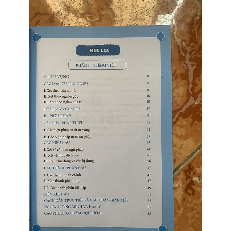 - Phần I: Tiếng Việt bao gồm từ vựng, ngữ pháp, các biện pháp tu từ, kiểu câu và phương châm hội thoại.