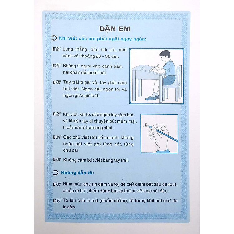 - Hướng dẫn cách ngồi viết đúng: lưng thẳng, đầu hơi cúi, mắt cách vở 20-30cm.