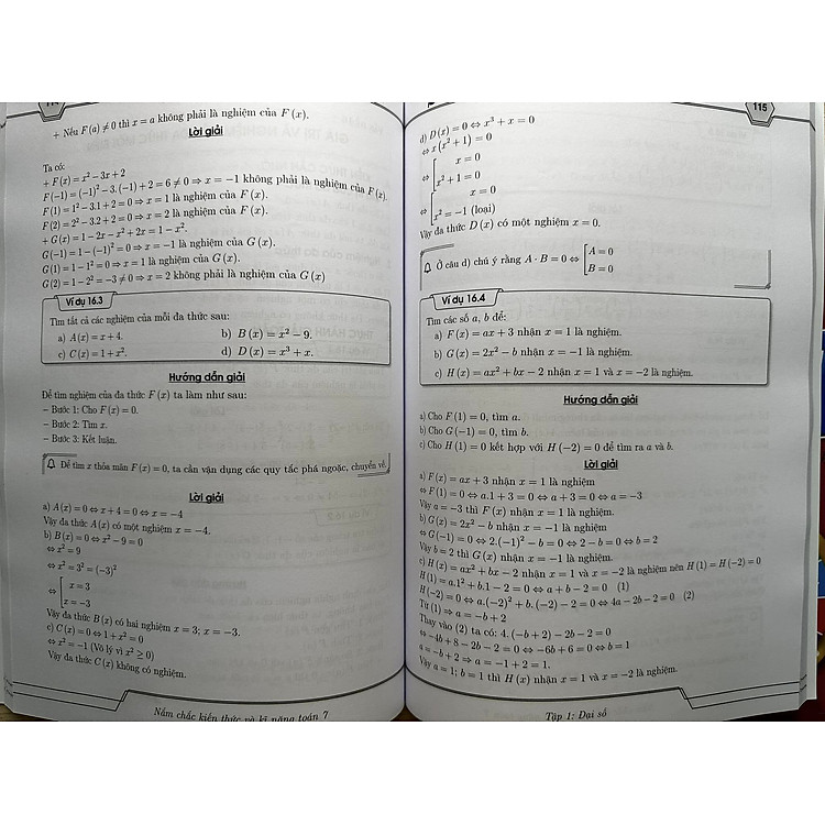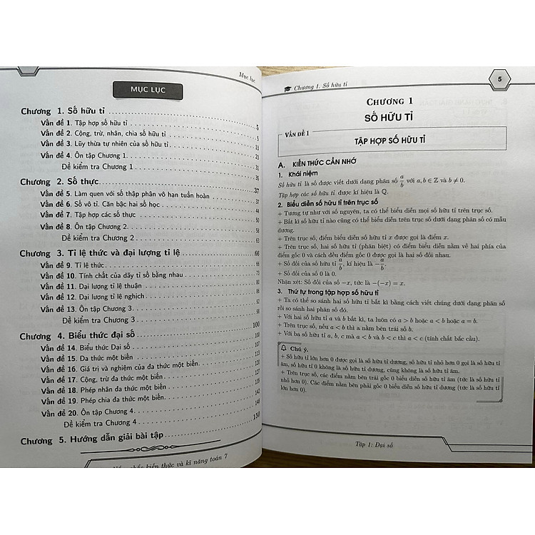 - Nội dung sách: Bao gồm 5 chương chính: Số hữu tỉ, Số thực, Tỉ lệ thức và đại lượng tỷ lệ, Biểu thức đại số, Hướng dẫn giải và bài tập.