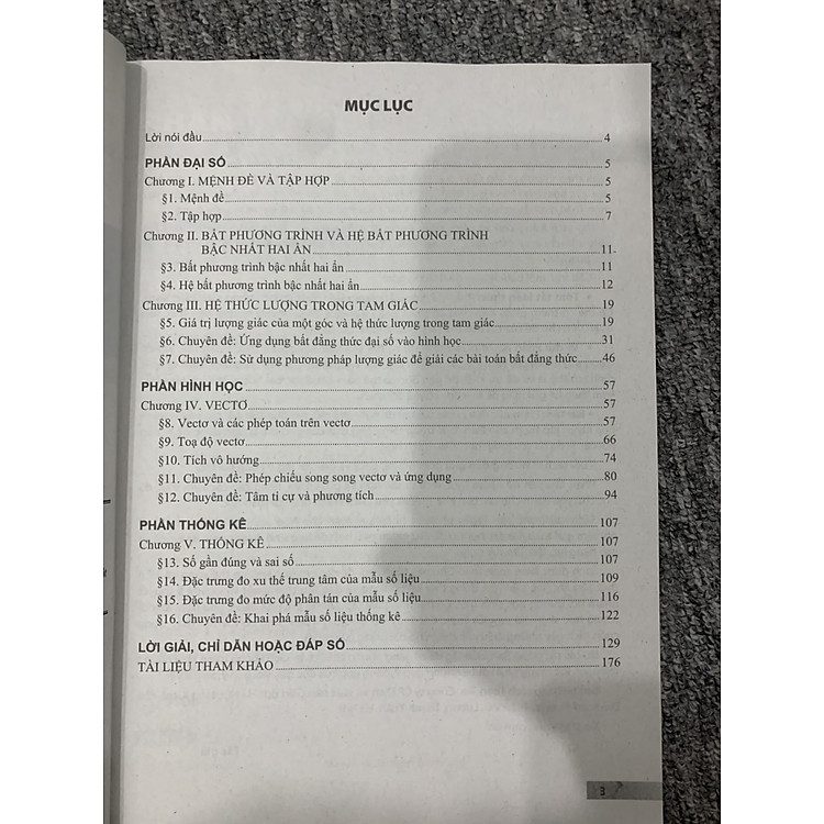 - Chương trong Tập 1: Mệnh đề, Bất phương trình, Hệ thực lượng, Vectơ, và Thống kê.