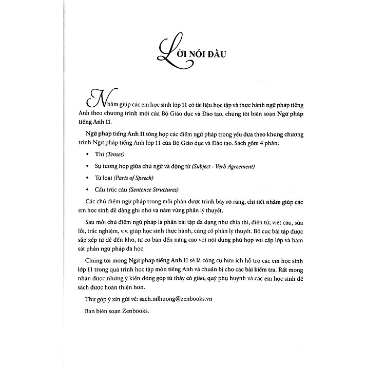 Chúng tôi mong Ngữ pháp tiếng Anh 11 sẽ là công cụ hữu ích hỗ trợ các em học sinh lớp 11 trong quá trình học tập môn tiếng Anh và chuẩn bị cho các bài kiểm tra. Rất mong nhận được những ý kiến đóng góp từ thầy cô giáo, quý phụ huynh và các em học sinh để sách được hoàn thiện hơn.