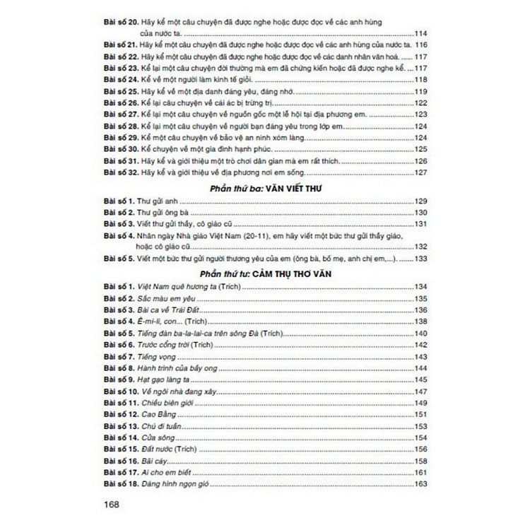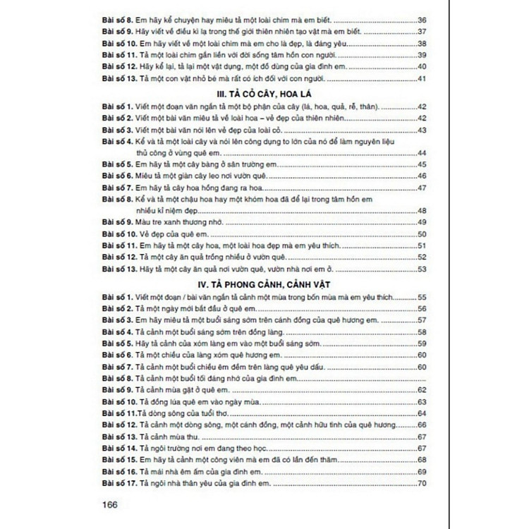 - Gồm nhiều thể loại: văn miêu tả, văn kể chuyện, văn viết thư, và cảm thụ thơ văn.