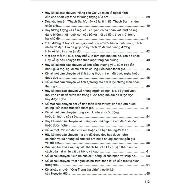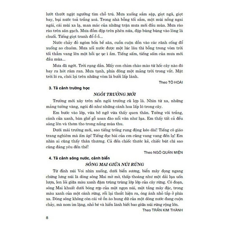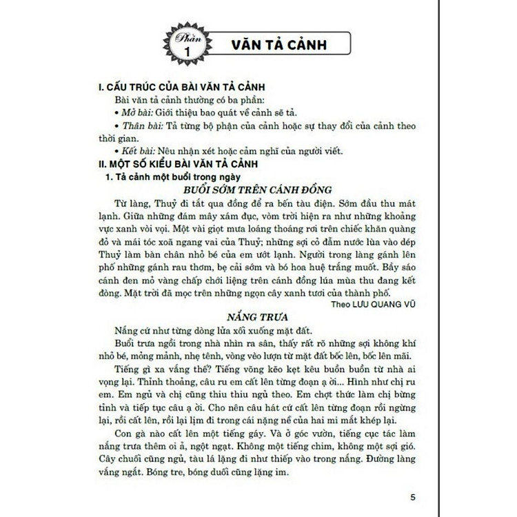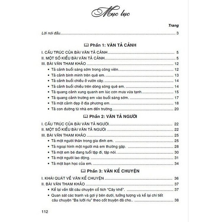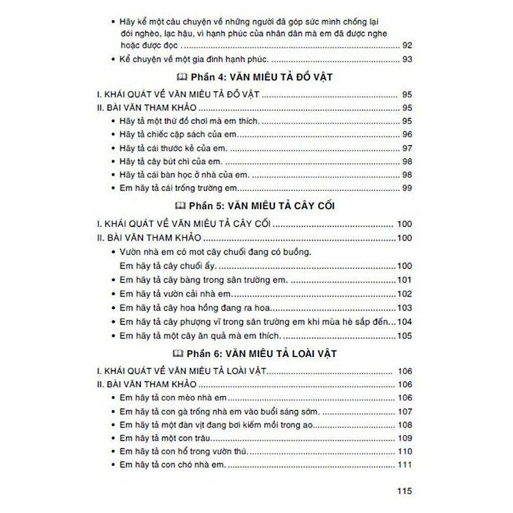 - Nội dung sách được chia thành 6 phần: tả cảnh, tả người, kể chuyện, miêu tả đồ vật, cây cối và loài vật.