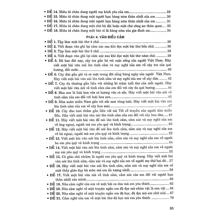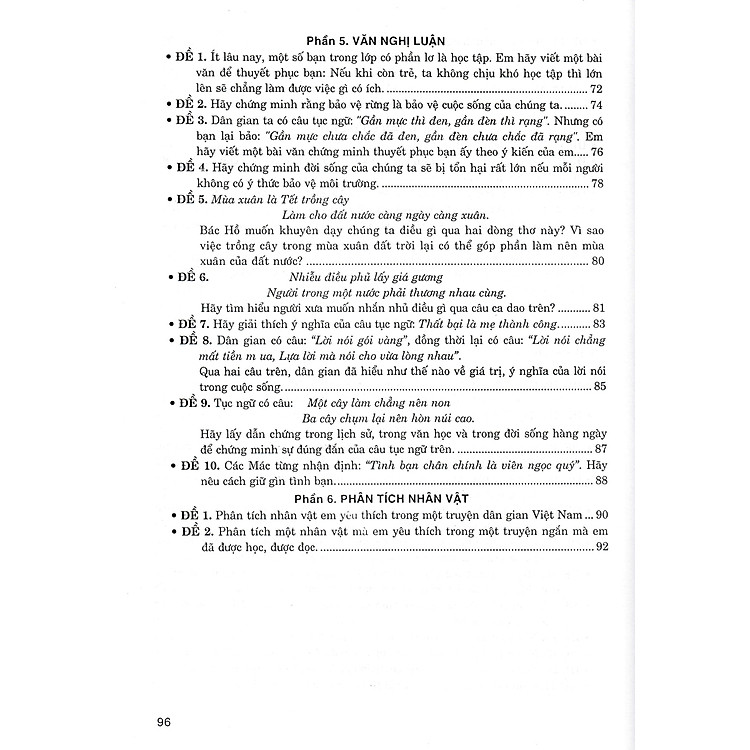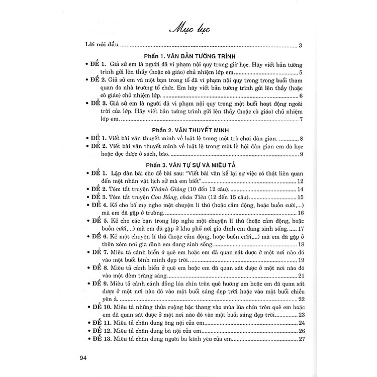 - Nội dung chia thành 6 phần: Văn bản tường trình, Văn thuyết minh, Văn tự sự và miêu tả, Văn biểu cảm, Văn nghị luận, Phân tích nhân vật.