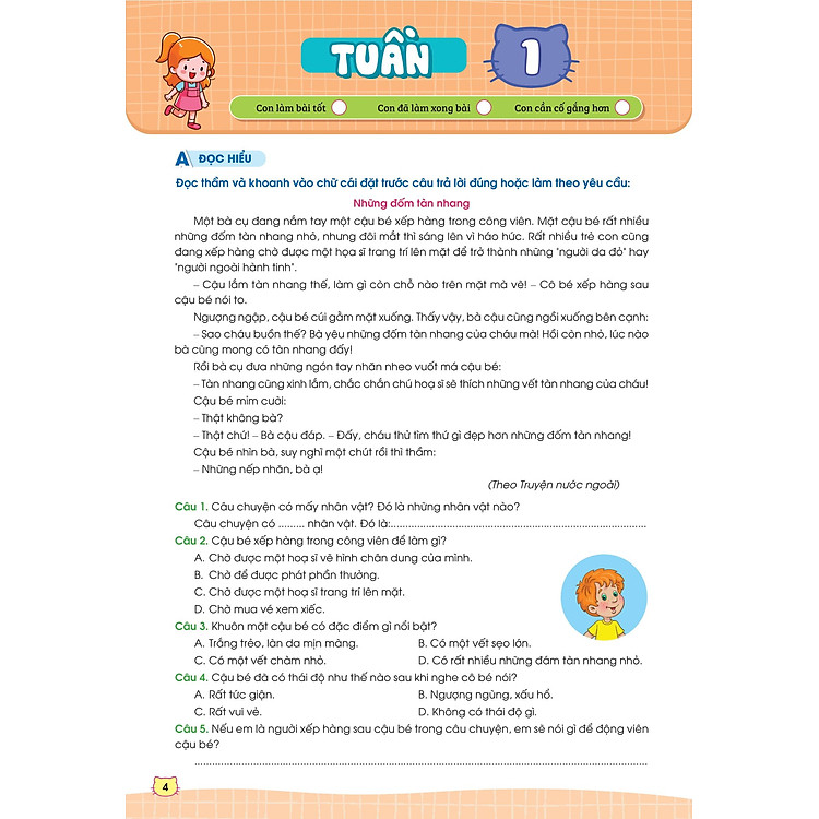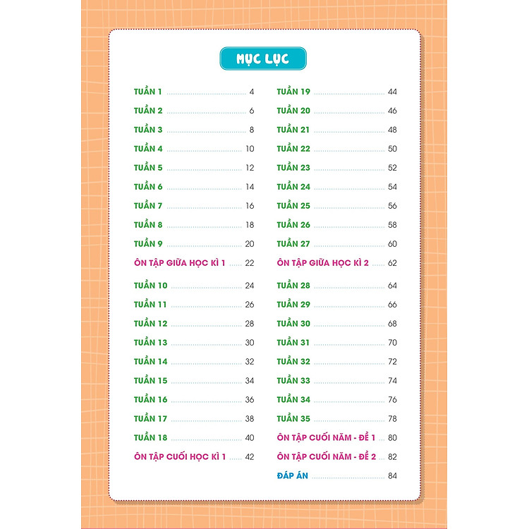 Bộ sách gồm các bài luyện tập chia theo tuần, ôn tập tổng quát kiến thức của 35 tuần học. Ngoài ra, cuốn sách cũng cung cấp các bài kiểm tra giữa kỳ và cuối kỳ để các con trau dồi thêm, tự tin chinh phục điểm cao trong các bài kiểm tra trên lớp.