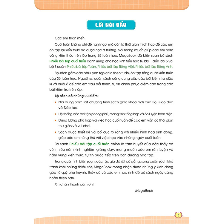 Cuối tuần không chỉ để nghỉ ngơi mà còn là thời gian thích hợp để các con ôn tập lại kiến thức đã được học ở trường. Với mong muốn giúp các con nắm vững kiến thức trên lớp trong 35 tuần học, chúng tôi đã biên soạn bộ sách Phiếu bài tập cuối tuần dành riêng cho học sinh tiểu học từ lớp 1 đến lớp 5 với bộ 3 cuốn: Phiếu bài tập Toán, Phiếu bài tập Tiếng Việt, Phiếu bài tập Tiếng Anh.