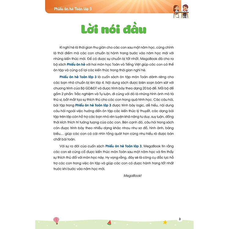 Với sự ra đời của cuốn sách Phiếu ôn hè Toán lớp 3, MegaBook tin rằng các con sẽ củng cố được kiến thức môn Toán sau một năm học và tìm thấy sự thích thú đối với môn học này. Hy vọng rằng, đây sẽ là công cụ đắc lực hỗ trợ các con trong việc ôn tập và giúp các con có được hành trang tốt nhất trước khi bước vào năm học mới.