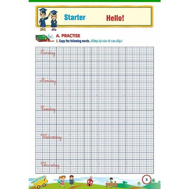 Các em sẽ luyện viết và học từ tiếng anh bằng các hình ảnh minh họa sinh động. Sau phần luyện viết từ vựng là các hoạt động chọn từ đúng, điền từ, ghép từ với hình thích hợp, sắp xếp từ. Nhằm giúp các em ôn luyện từ vựng đã học. Sau mỗi 3 đơn vị bài học có phần ôn tập (Review) với các hoạt động lý thú giúp các em củng cố kiến thức.
