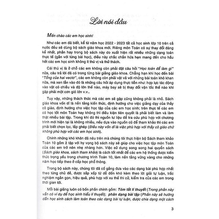 Việc sử dụng song song hai quyến sách (Sách giáo khoa, sách tham khảo) là cách tốt nhất để các em hệ thống được kiến thức trọng yếu trong chương trình toán 10, làm nền tảng vững vàng cho những năm học tiếp theo ở cấp học phổ thông.