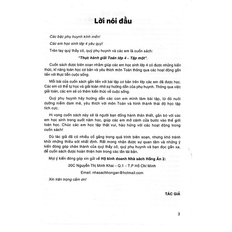 Thực Hành Giải Toán Lớp 4 Tập 1 (Dùng Chung Cho Các Bộ SGK Hiện Hành) Các bậc phụ huynh kính mến! Các em học sinh lớp 4 yêu quý! Trên tay quý thầy cô, quý phụ huynh và các em là cuốn sách: “Thực hành giải Toán lớp 4 – Tập một”. Cuốn sách được biên soạn nhằm giúp các em học sinh lớp 4 có được những kiến thức, kĩ năng toán học cơ bản và yêu thích môn Toán thông qua các hoạt động gắn liền với thực tiễn cuộc sống. Mỗi bài của cuốn sách gắn liền với bài tập cơ bản trên lớp các em đã được học. Các em có thể tự học và giải toán nhờ sự hướng dẫn của phụ huynh. Thông qua việc giải toán, các em sẽ có thêm kiến thức về cuộc sống. Các bài tập cơ bản trên lớp Quý phụ huynh hãy hướng dẫn các con em mình làm bài tập, từ đó nuôi dưỡng niềm đam mê, yêu thích với môn Toán và hình thành thái độ học tập tích cực. Hi vọng cuốn sách này sẽ là người bạn đồng hành thân thiết, gắn bó với các em học sinh trong suốt năm học, giúp các em mở cánh cửa bước vào thế giới toán học. Chúc các em học tập thật vui, hào hứng với các hoạt động trong cuốn sách! Dù tác giả đã có nhiều cố gắng trong quá trình biên soạn, nhưng khó tránh khỏi những thiếu sót nhất định. Rất mong nhận được sự quan tâm và những ý kiến đóng góp chân thành của quý thầy cô, quý phụ huynh và bạn đọc gần xa, để cuốn sách được hoàn thiện hơn trong các lần tái bản.