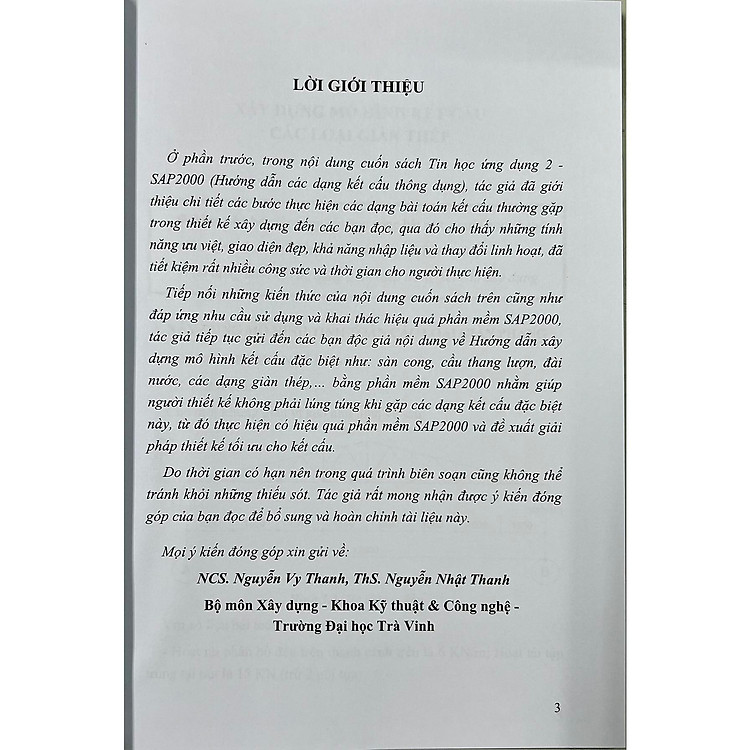 Sách – Tin Học Ứng Dụng 2 SAP2000 là tài liệu quý giá dành cho các kỹ sư xây dựng, sinh viên ngành kỹ thuật và những ai đang quan tâm đến việc ứng dụng phần mềm SAP2000 trong thiết kế và phân tích kết cấu. Được biên soạn bởi Trường Đại học Trà Vinh, cùng sự đóng góp của NCS. Nguyễn Vy Thanh và ThS. Nguyễn Nhật Thanh, cuốn sách mang đến một cái nhìn sâu sắc và hệ thống về cách xây dựng mô hình kết cấu đặc biệt.