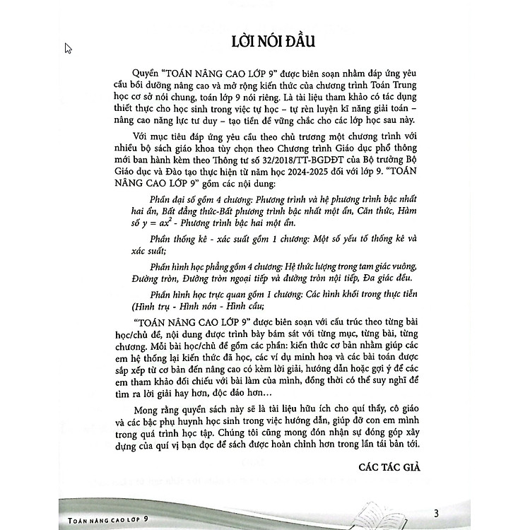 Chúng tôi hy vọng rằng quyển sách này sẽ đáp ứng được nhu cầu học tập của bạn, và chúng tôi luôn sẵn sàng lắng nghe ý kiến đóng góp từ bạn đọc để hoàn thiện hơn trong các lần tái bản sau. Hãy bước vào thế giới toán học đầy thú vị với Toán Nâng Cao 9.Toán Nâng Cao 9Toán Nâng Cao 9 sẽ là người bạn đồng hành tuyệt vời trong hành trình học tập của bạn. Quyển sách này do tác giả Phan Văn Đức và Phan Thái Khang biên soạn, nhằm đáp ứng nhu cầu bồi dưỡng và mở rộng kiến thức cho học sinh lớp 9 trong chương trình Toán Trung học cơ sở. Nếu bạn đang tìm kiếm một tài liệu tham khảo hữu ích để tự học và rèn luyện kỹ năng giải toán nâng cao, thì đây chính là lựa chọn lý tưởng cho bạn.