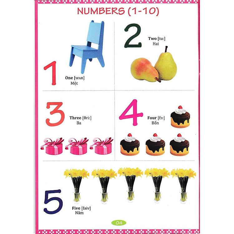 - Nội dung bao gồm: bảng chữ cái, số từ 1-10, màu sắc, gia đình, đồ dùng trong nhà, dụng cụ học tập, đồ chơi, nhạc cụ, giao thông, cơ thể, nghề nghiệp, trang phục, thể thao, đồ ăn, hoa, rau củ, trái cây, động vật hoang dã và động vật nuôi.