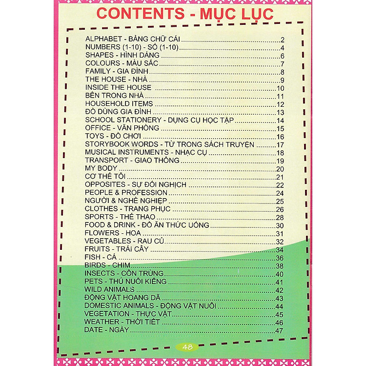 Từ Điển Anh Việt Bằng Hình Ảnh gồm các nội dung:Alphabet – Bảng chữ cáiNumbers (1-10) – Số (1-10)Colours – Màu sắcFamily – Gia đìnhThe house – NhàInside the house – Bên trong nhàHousehole items – Đồ dùng gia đìnhSchool stationery – Dụng cụ học tậpOffice – Văn phòngToys – Đồ chơiStorybook words – Từ trong sách truyệnMusical instruments – Nhạc cụTransport – Giao thôngMy body – Cơ thểOpposites – Sự đối nghịchPeople & Profession – Người & Nghề nghiệpClothes – Trang phụcSports – Thể thaoFood & Drink – Đồ ăn thức uốngFlowers – HoaVegetables – Rau củFruits – Trái câyFish – CáBirds – ChimInsects – Côn trùngPets – Thú nuôi kiểngWild animals – Động vật hoang dãDomestic animals – Động vật nuôiVegetation – Thực vậtWeather – Thời tiếtDate – Ngày