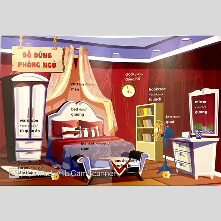 Cuốn từ điển này bao gồm nhiều chủ đề khác nhau như đồ dùng phòng khách, phòng ngủ, phòng bếp, phòng tắm, hình dạng, màu sắc, bộ phận cơ thể và các loại hoa. Điều này giúp trẻ dễ dàng tiếp cận và làm quen với ngôn ngữ qua những hình ảnh sinh động.
