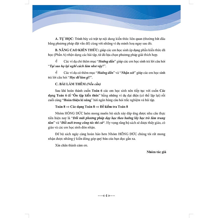 Cách biên soạn dựa trên những hiểu biết chuyên môn của các thành viên nhóm Hồng Đức, những người có trình độ sư phạm cao, và có nhiều năm kinh nghiệm giảng dạy toán ở cấp THCS. Tất cả chỉ để phù hợp với những thay đổi trong công cuộc cải cách giáo dục của nước ta hiện nay.