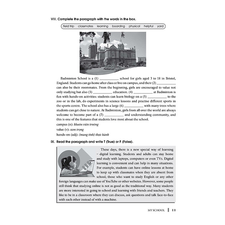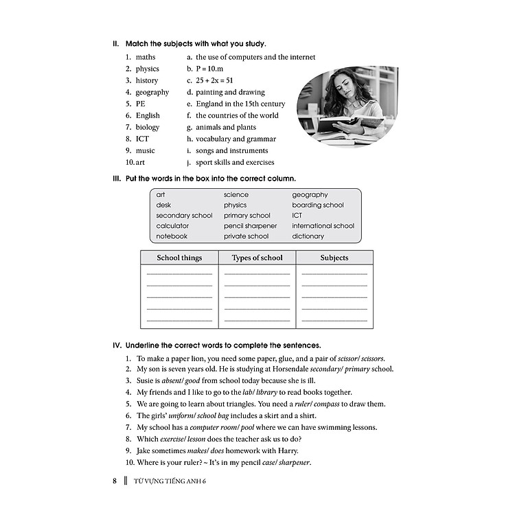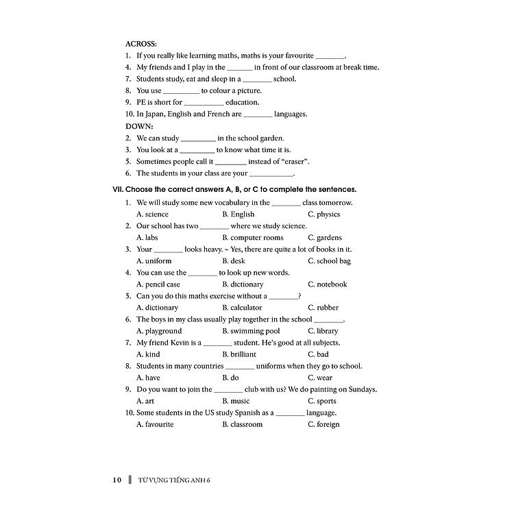 – Phần Bài tập (Exercises): Giới thiệu phần bài tập phong phú, đa dạng như điền từ, giải ô chữ, đọc hiểu, từ đồng nghĩa- trái nghĩa, chia dạng thức của từ, trắc nghiệm, viết câu, giải đố, trả lời câu hỏi, giúp học sinh củng cố và ôn luyện các từng vựng đã học một cách hiệu quả. Bố cục bài tập được sắp xếp từ dễ đến khó, từ cơ bản đến nâng cao với nội dung phù hợp với cấp lớp và bán sát phần Tự Vựng.